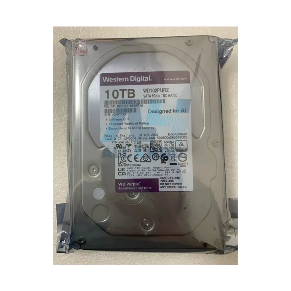 The Western Digital WD102PURZ is a 10TB surveillance-optimized hard drive from the WD Purple series, engineered for advanced AI-enabled recorders, video analytics appliances, and deep-learning servers. With a 7200 RPM rotational speed and a 256MB cache, it delivers high-performance storage for demanding video surveillance environments. Utilizing CMR (Conventional Magnetic Recording) technology, this drive ensures consistent and reliable data handling, making it suitable for 24/7 operation in multi-bay systems.